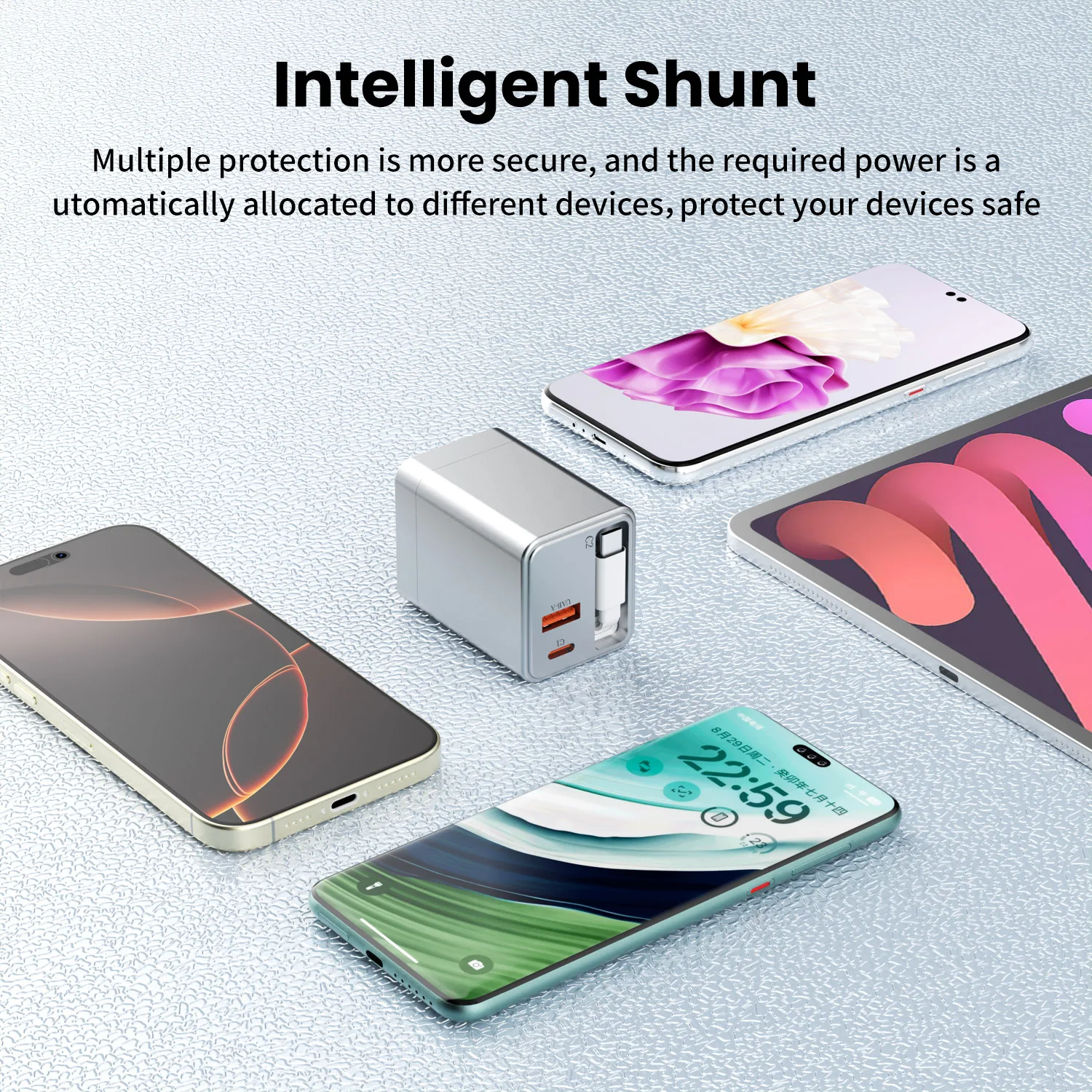 This 3-in-1 charger block features a modern design with one Type-C port, one USB-A port, and one built-in retractable cable for convenient storage. Charge up to three devices at the same time to meet different charging needs.