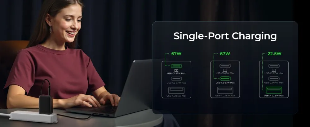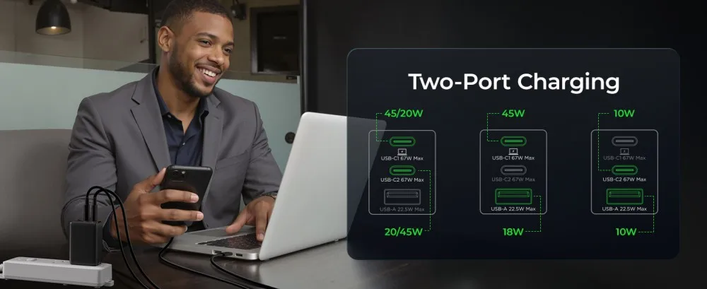 - USB-C1 + USB-C2: 45W + 20W (20V2.25A PD3.0 / 11V3A PPS + 9V2.22A PD3.0)