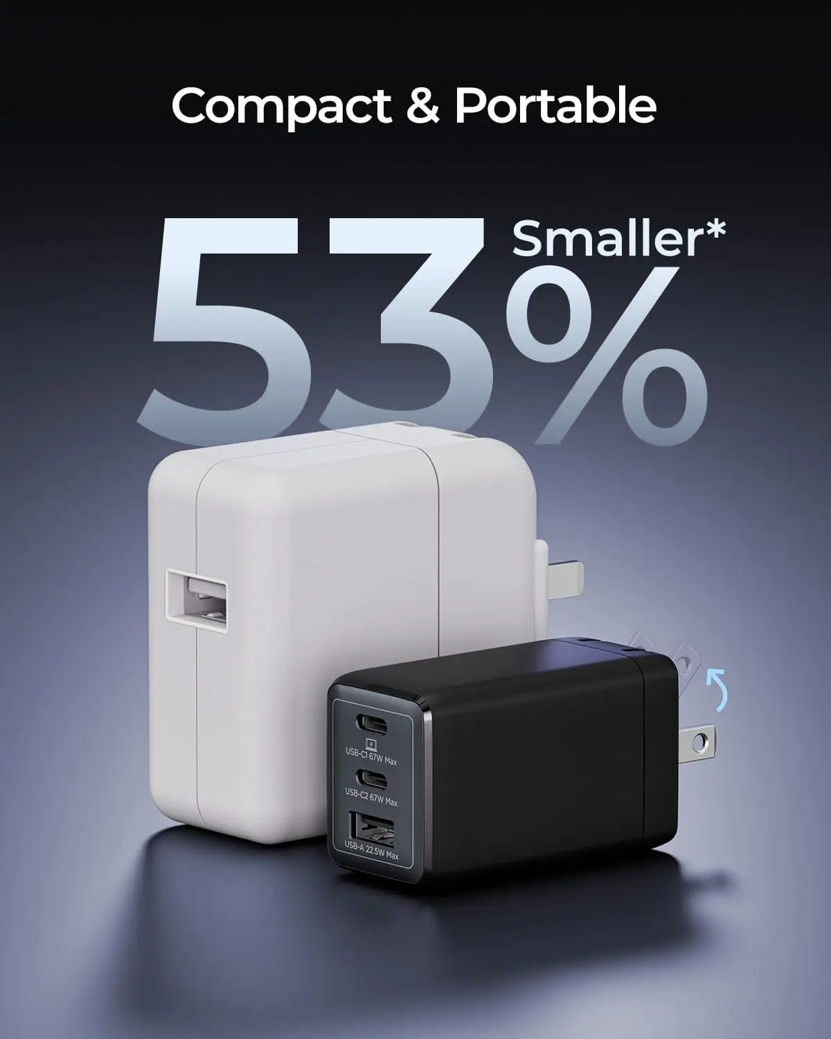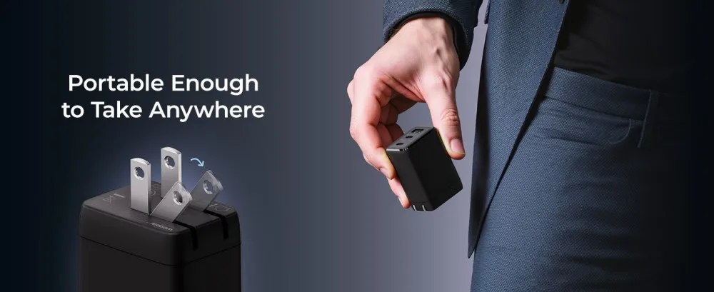 This charger features a compact body and a foldable plug for easier storage and travel.