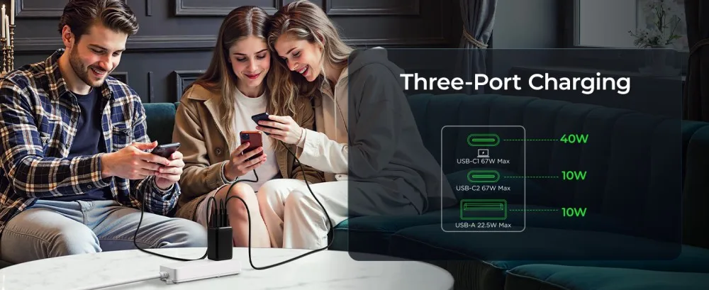 - USB-C1 + USB-C2 + USB-A: 40W + 10W + 10W (5V3A, 9V3A, 15V2.67A, 20V2A PD3.0 / 11V3A max PPS + 5V2A + 5V2A)