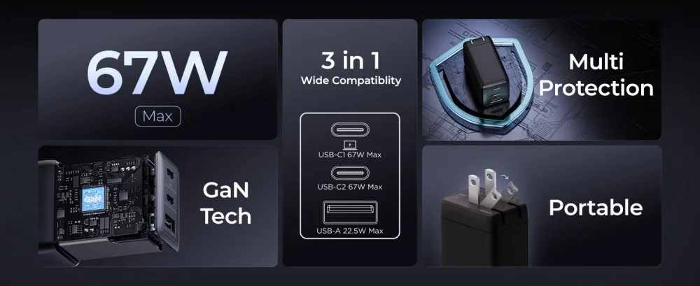 - USB-C2: 67W max supported protocols: PPS, PD3.0, QC3.0, QC2.0, SCP, FCP, Apple 2.4A, SAMSUNG 2.0A, BC1.2