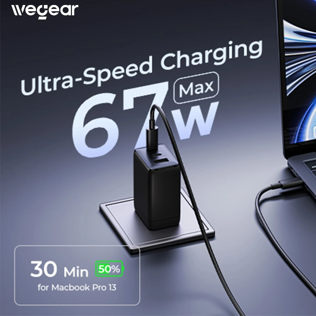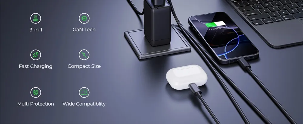 Featuring 2 USB-C ports and 1 USB-A port, this wall charger delivers up to 100W total output for charging up to three devices at once. It is suitable for phones, tablets, and laptops.