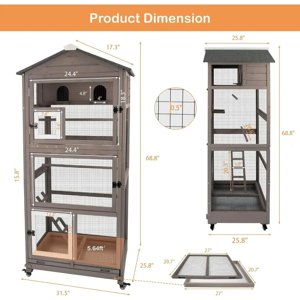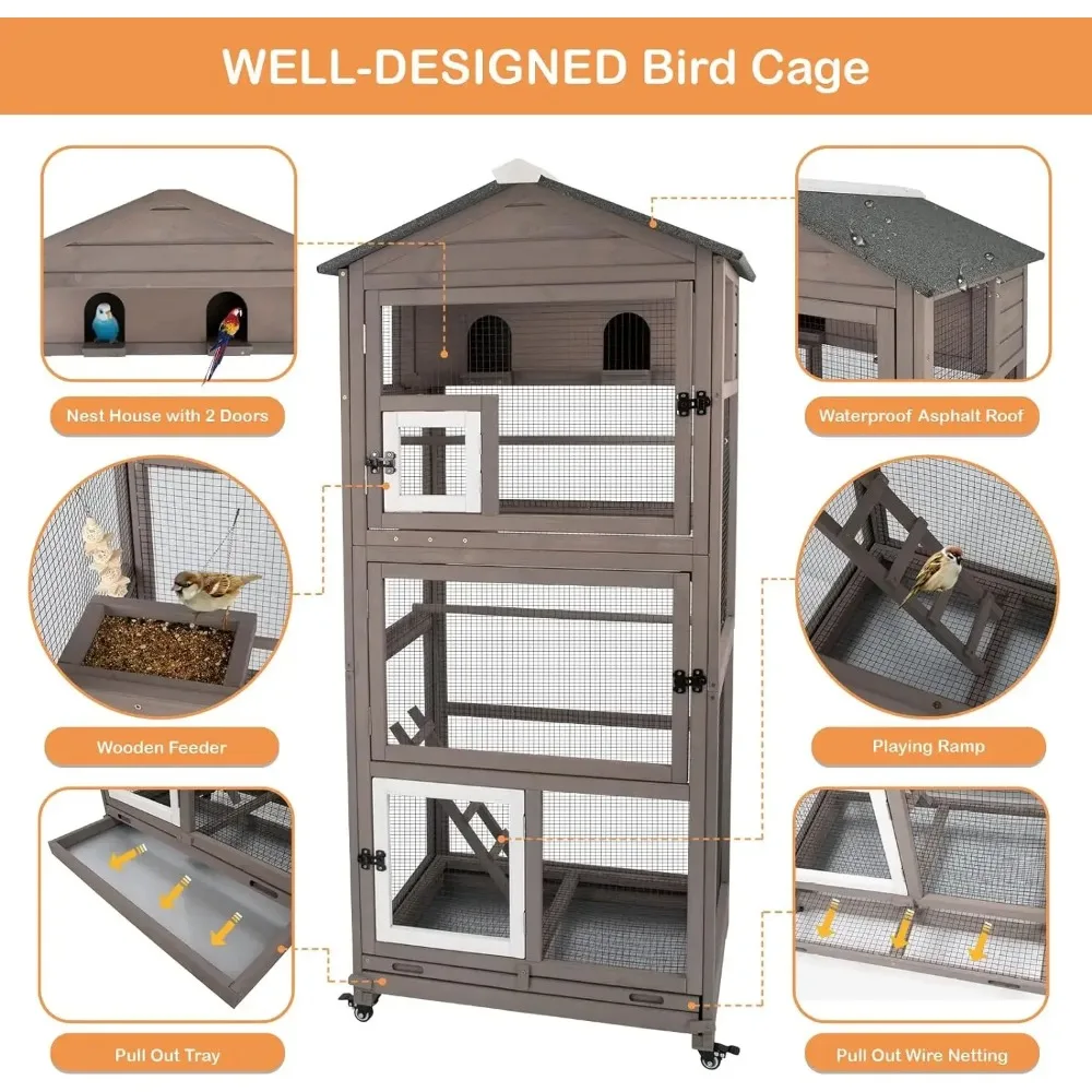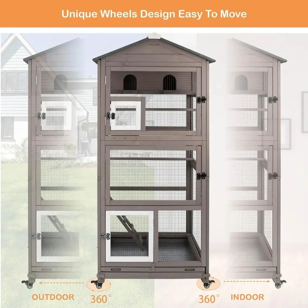 68.8-inch Large Wooden Bird Aviary Cage with Wheels