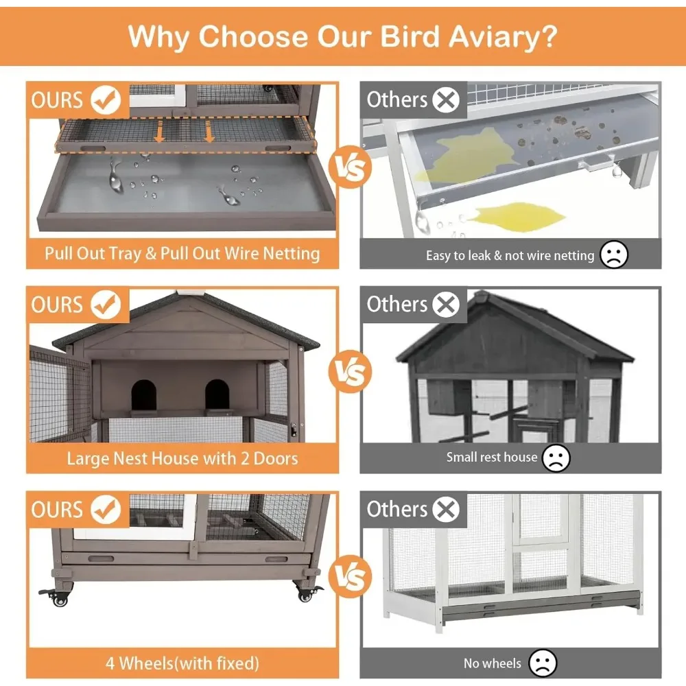 - Large Bird Cage: Made of fir wood with an asphalt roof for durability against sun and rain. This bird aviary provides a controlled environment, ideal for breeding and caring for young birds. It supports natural curiosity, encourages active exploration, and promotes both mental and physical health. Note: Using anti-chewing toys (not included) helps reduce damage to the internal structure and wood of the birdcage.