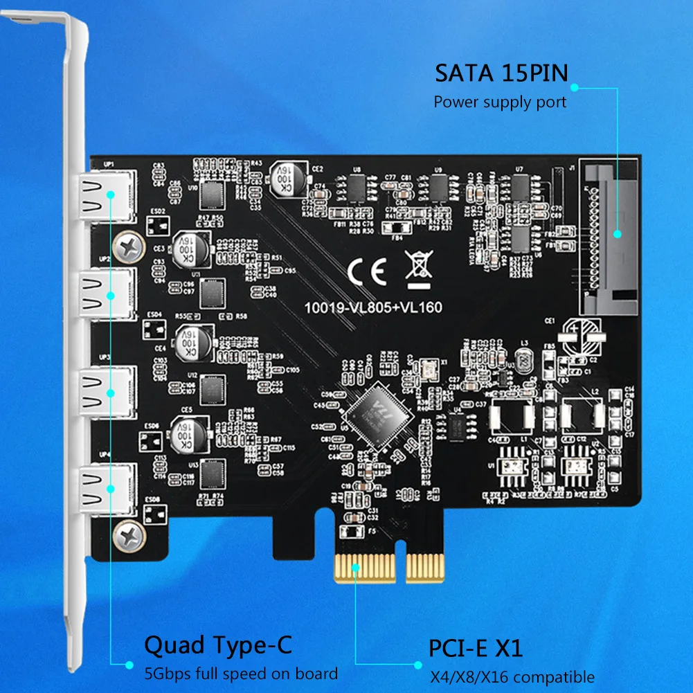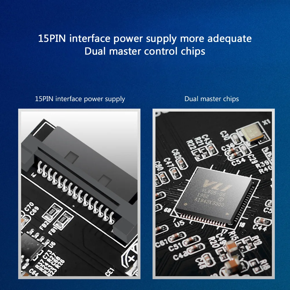 - Uses VL805 and VL160 main control chips, with a 15-pin SATA power connector.