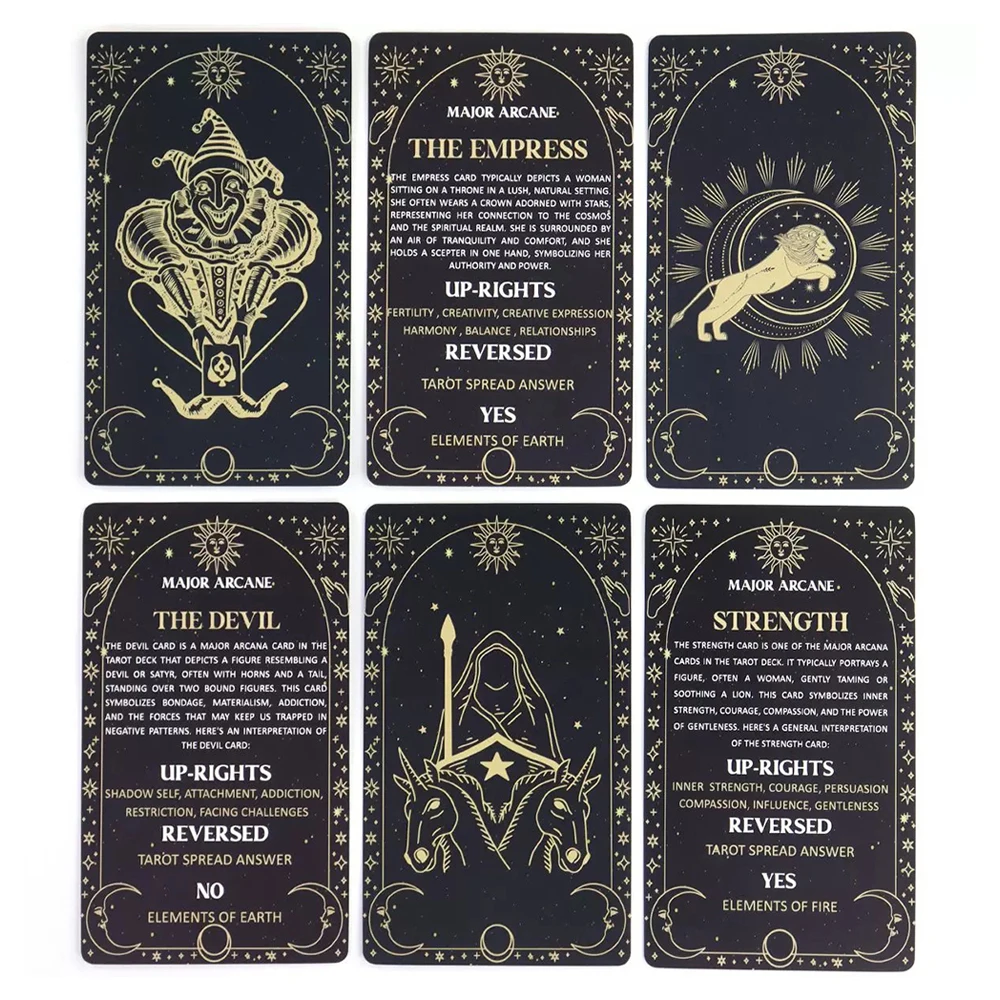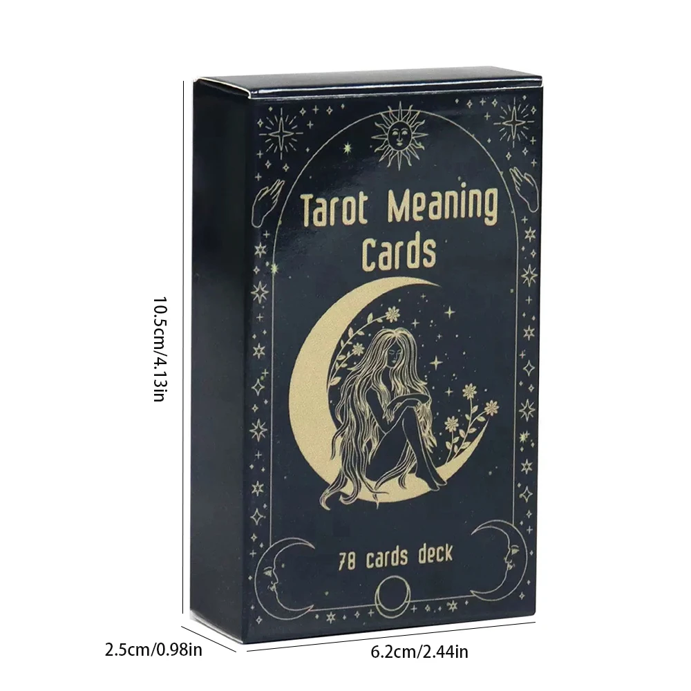 Designed with a sleek black and gold celestial theme, this deck looks great on the table and feels easy to use for beginners, casual readers, and anyone who wants quick reference support during a reading.