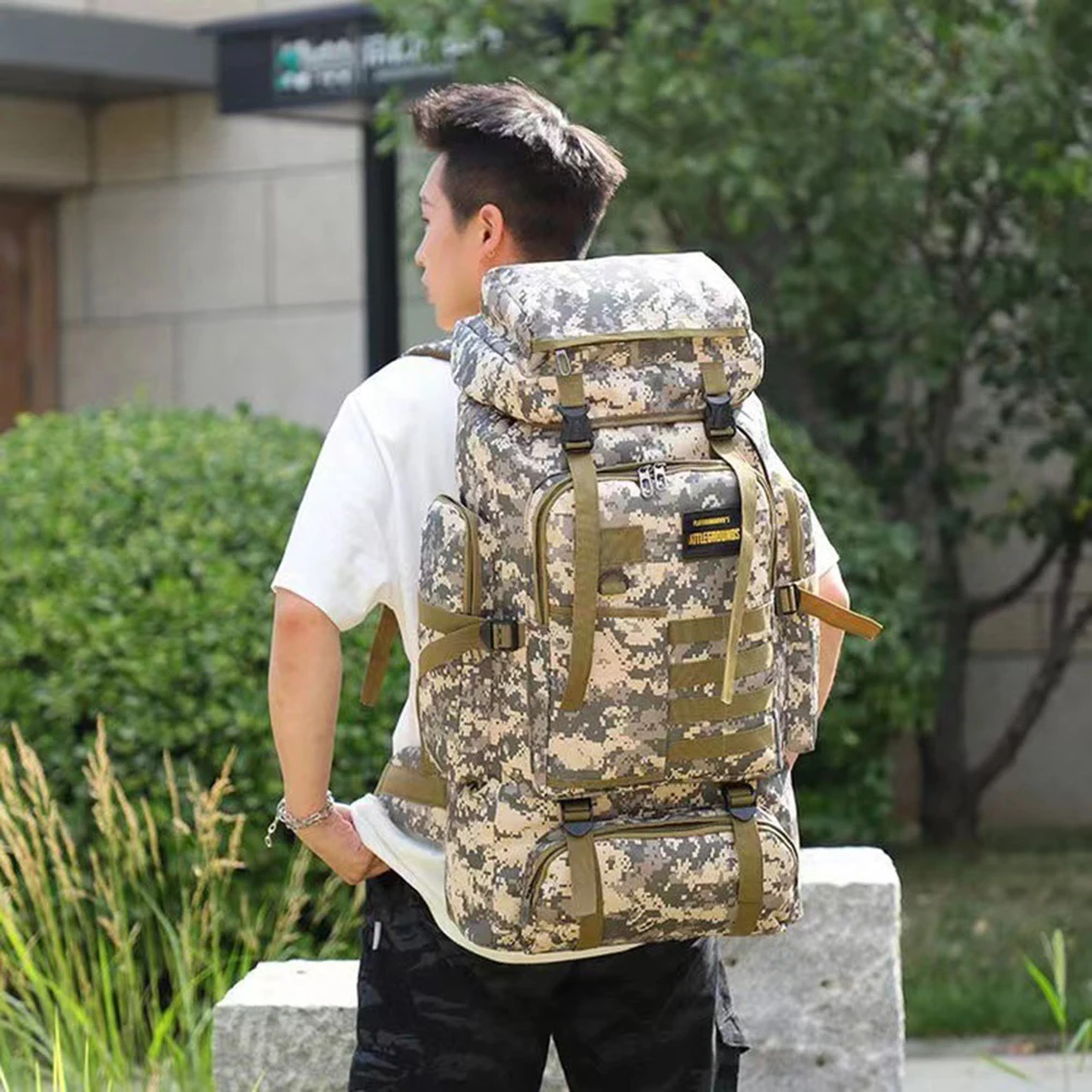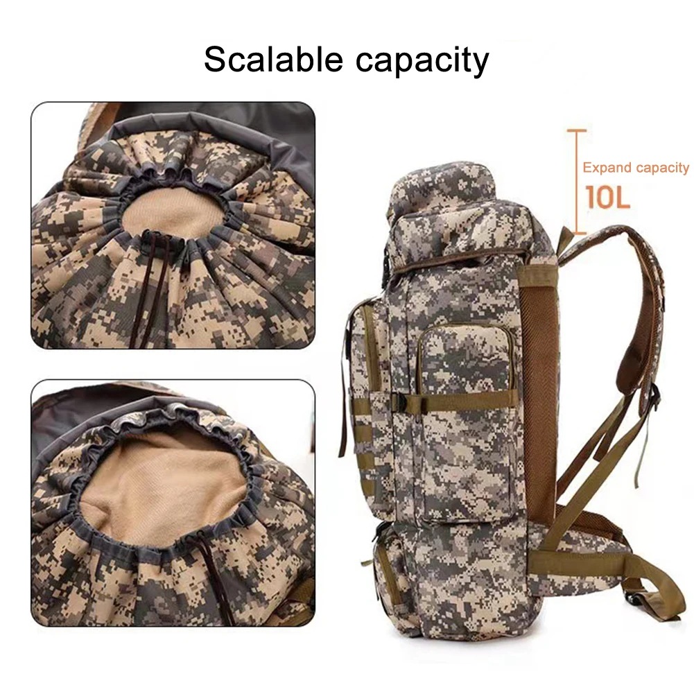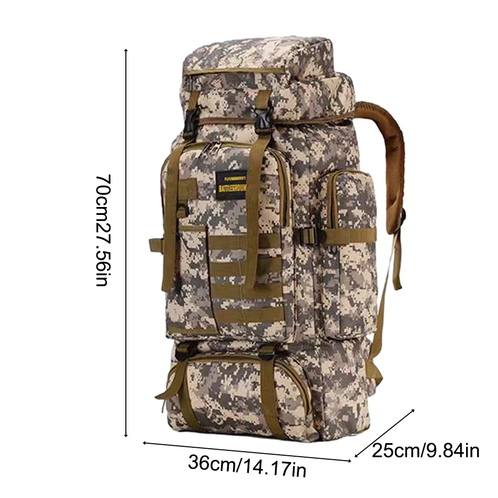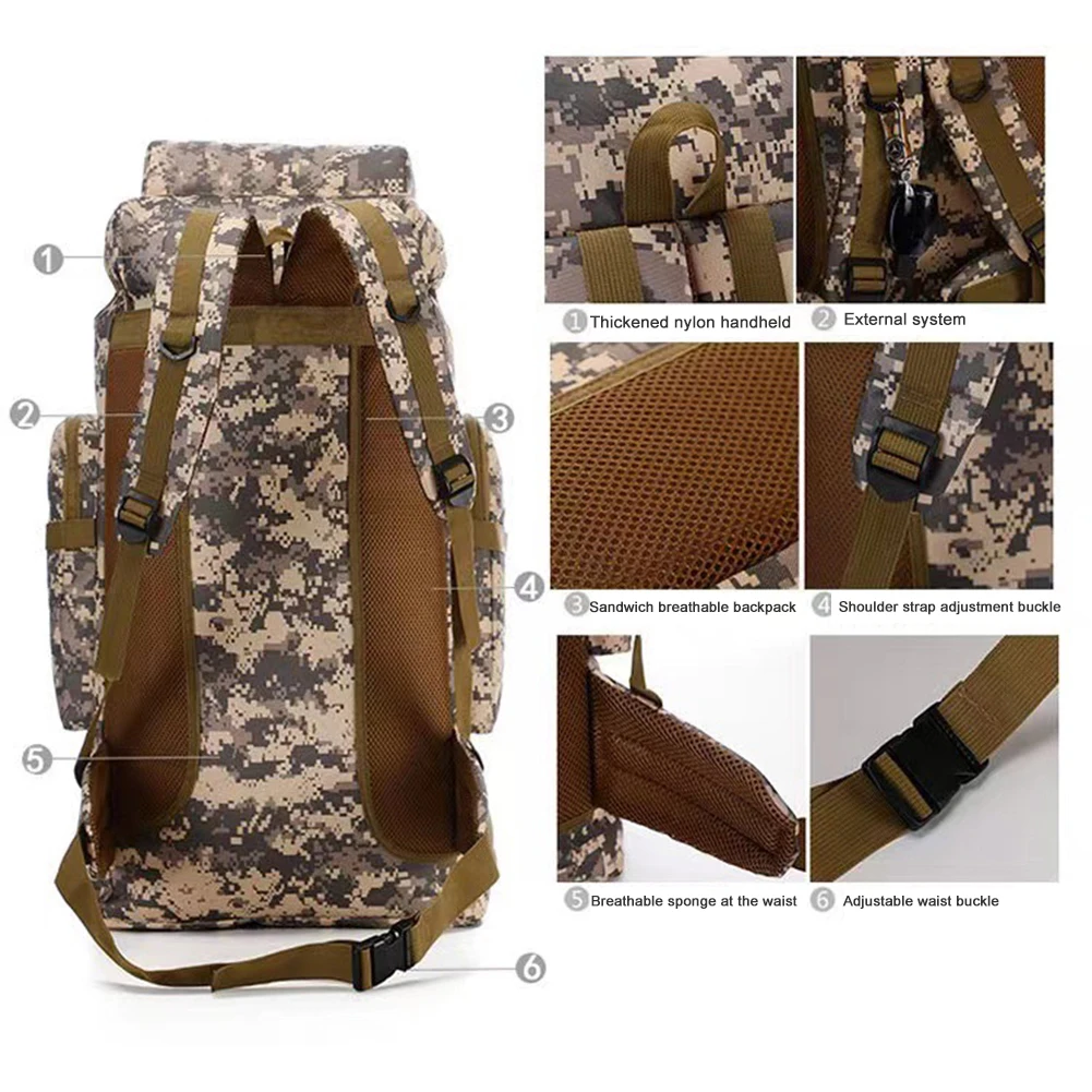 - Spacious and Versatile Load Capacity: This outdoor military backpack offers a large storage space with its multi-functional layered external hanging system. It features a generous main compartment and three additional external hanging systems, allowing you to attach hiking poles, mats, and other gear for your outdoor adventures.