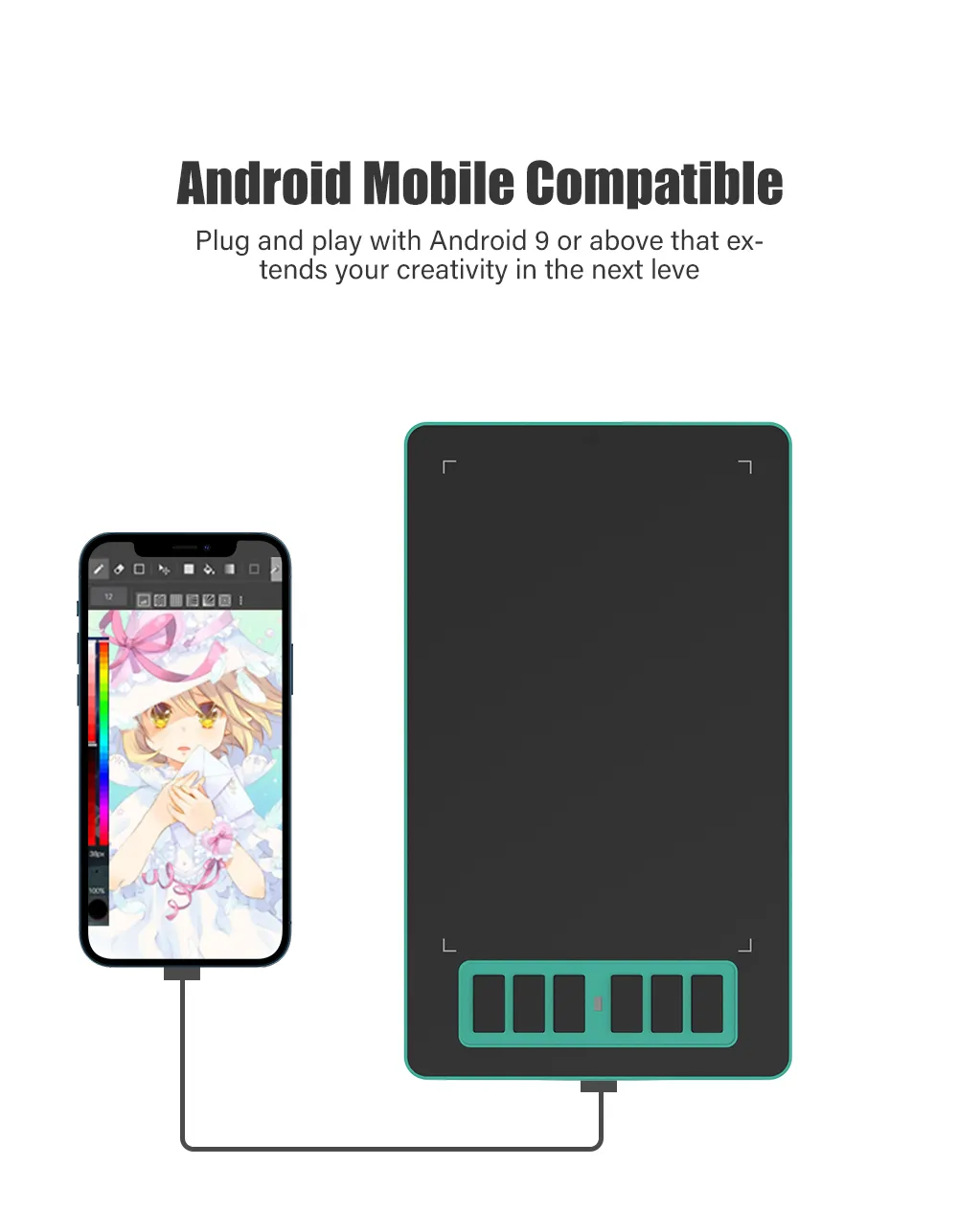 Plug and play with Android 9 or above that extends your creativity to the next level; using an OTG adapter, you can connect to an Android phone or tablet, and we will give away a Type-C adapter.