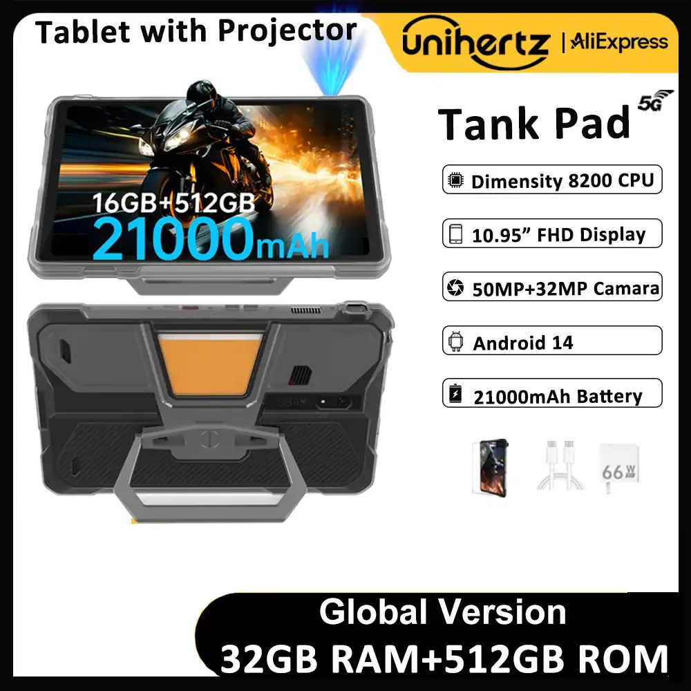 The Unihertz TANK PAD is a powerful projector tablet built for entertainment, productivity, travel, and outdoor use. Designed with a large 10.95-inch FHD display, a massive 21000mAh battery, and a built-in 100-lumen DLP projector, it brings together tablet performance and portable projection in one rugged device. This model is ideal for users who want a larger screen experience, strong battery life, bright projection capability, and advanced hardware features in a single mobile device.