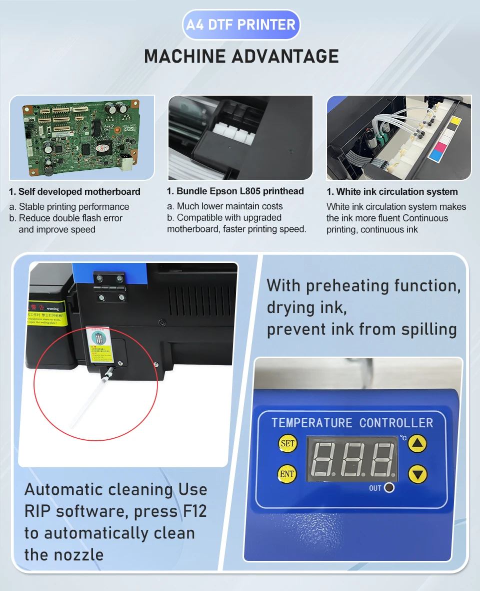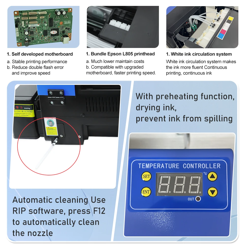 - White ink circulation system: Ensures smoother ink flow and continuous printing without interruptions.