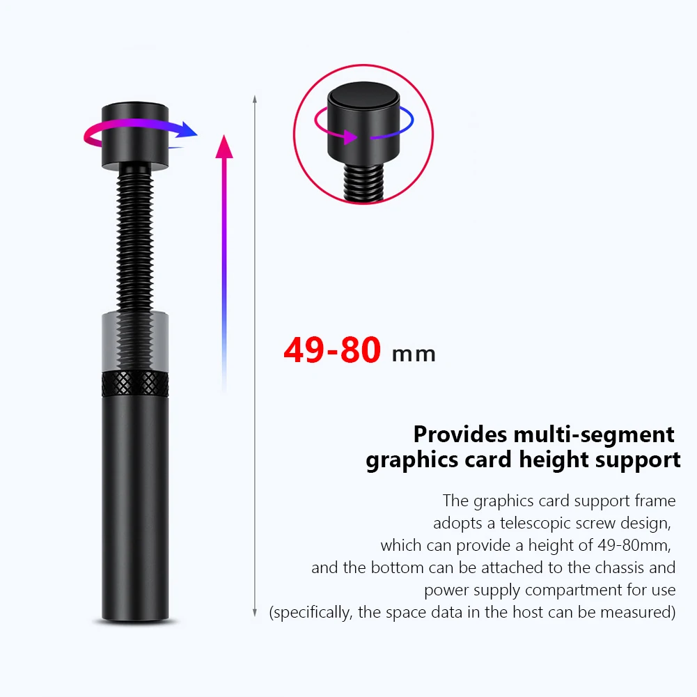 1. Telescopic screw design: The graphics card bracket adopts a telescopic screw design, and the GX-30 provides a height support range of 49 to 80mm. The height can be adjusted freely to adapt to various chassis specifications and provide effective support for the rear of the graphics card.