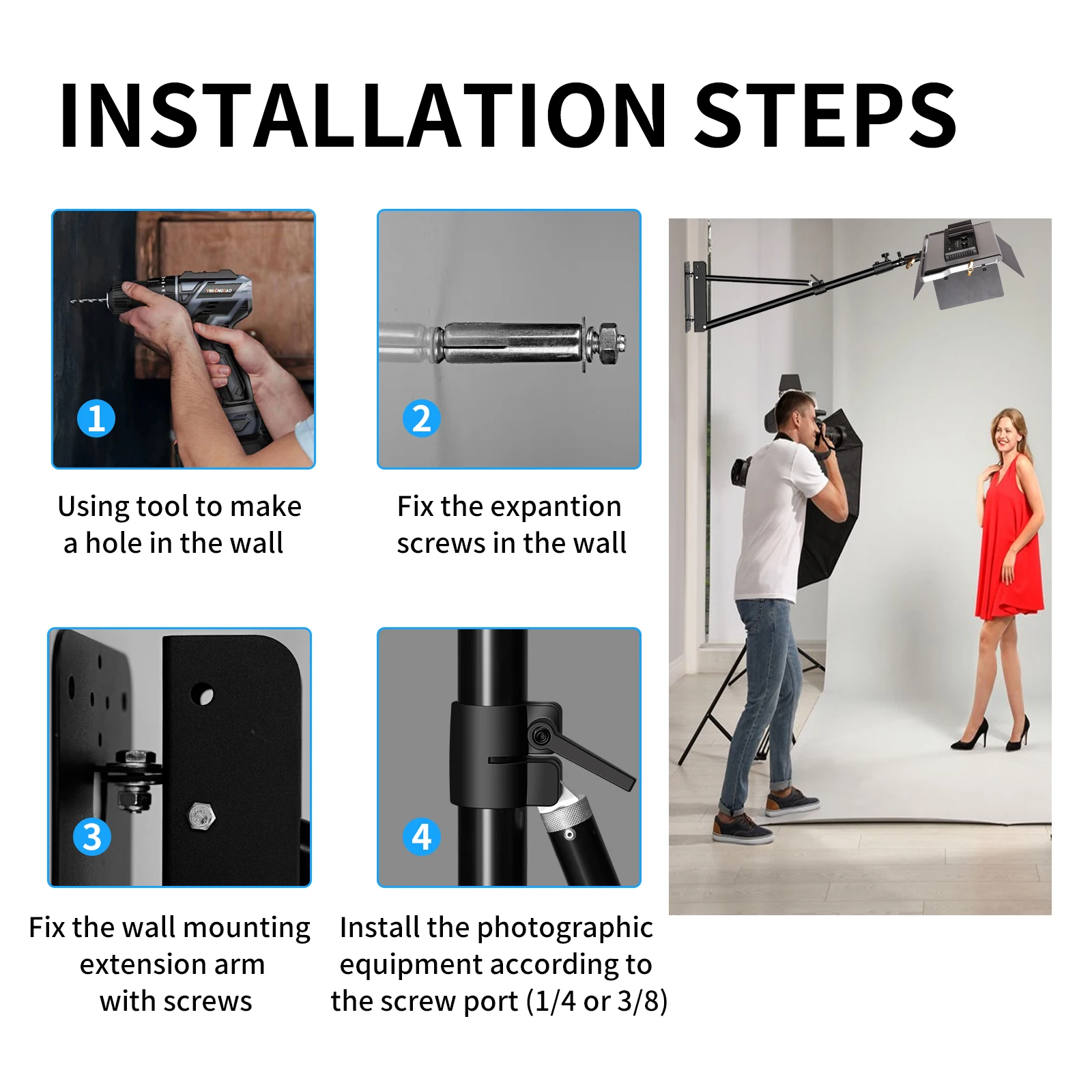 - This wall-mount boom arm light stand must be fixed to a solid wall.