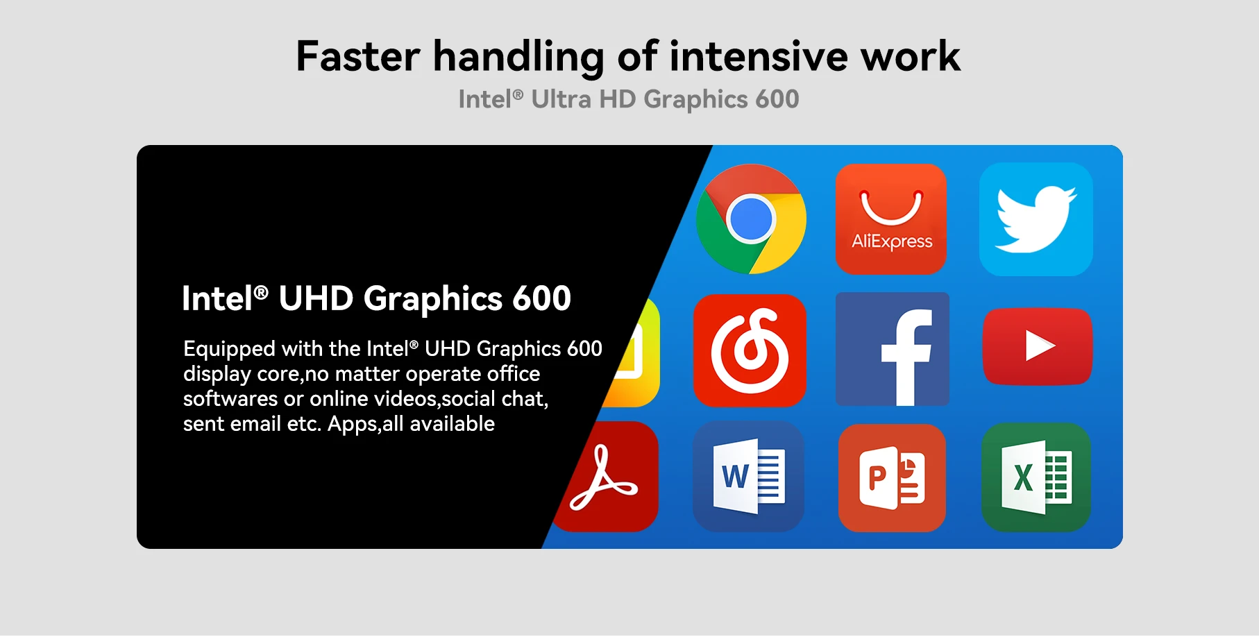 Equipped with the Intel® UHD Graphics 600 display core, whether for office software, online videos, social chat, or email, all applications are supported