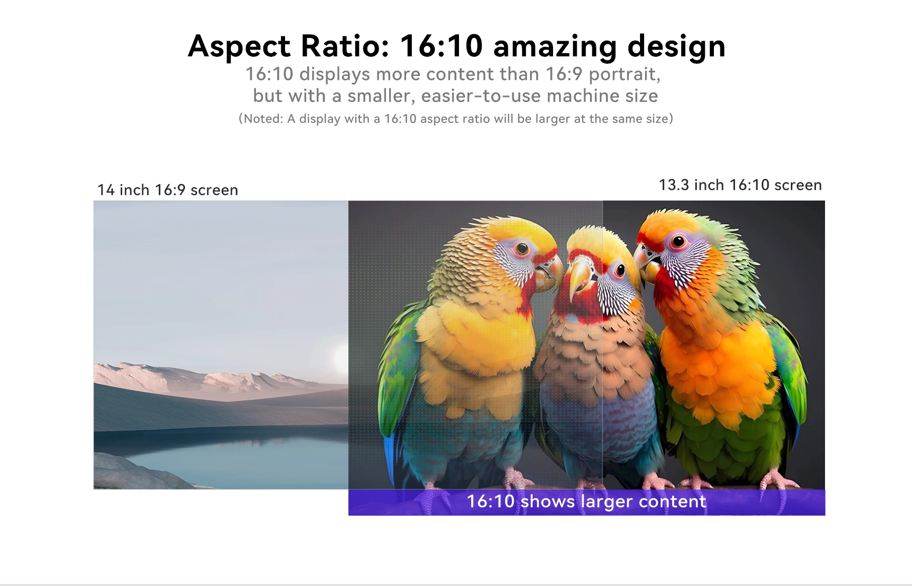 16:10 displays more content than 16:9, but with a smaller, easier-to-use machine size
