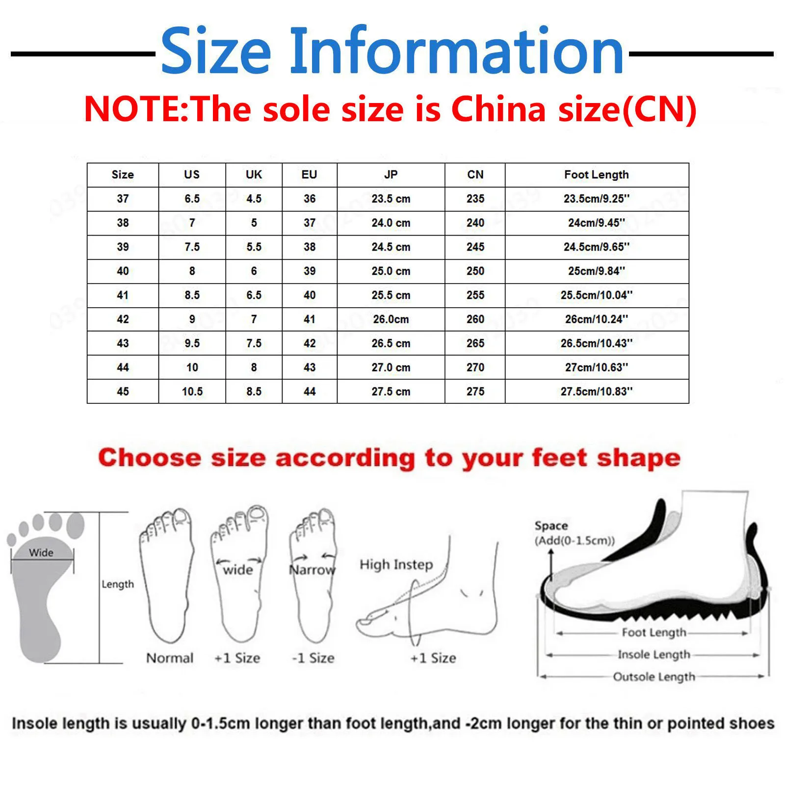 - Size 39: US 7.5, UK 5.5, EU 38, JP 24.5 cm, CN 245, Foot Length 24.5 cm / 9.65 inches