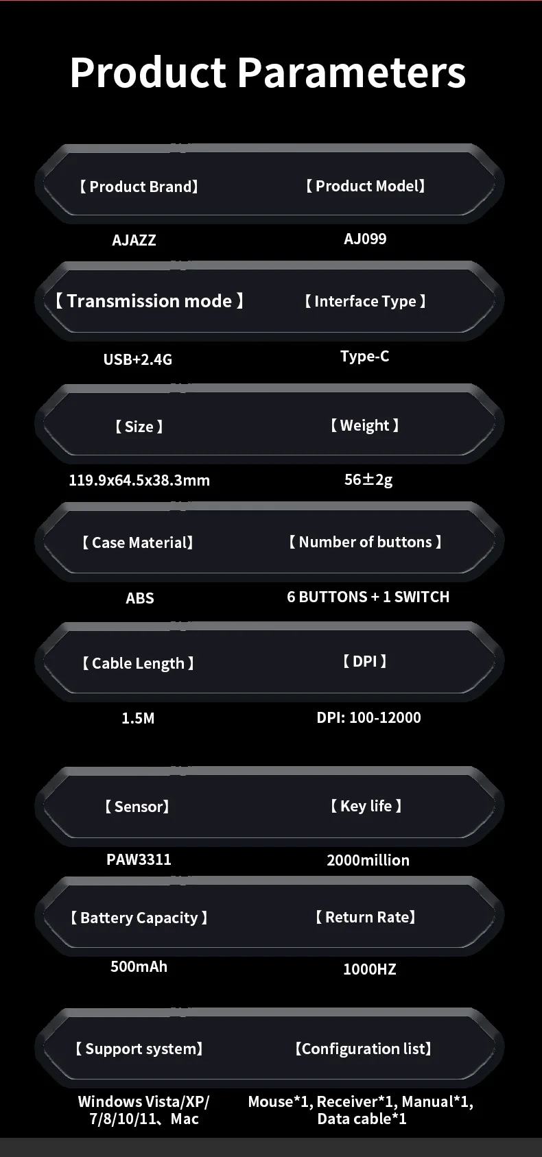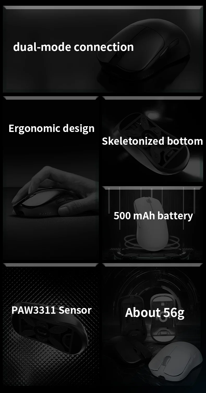 The images present the AJAZZ AJ099 as a dual-mode gaming mouse focused on comfort and everyday performance. The graphics highlight dual-mode connection (shown as USB + 2.4G) and a Type-C interface. The spec panel in the images lists a PAW3311 sensor and a DPI range shown as 100 to 12000. The images also display a 500mAh battery and an estimated usage statement of about 40 hours. Weight is shown as about 56g (with a tolerance shown in the image), and the layout graphic shows standard mouse buttons, including left and right clicks, scroll wheel, and side buttons. The product parameter graphic also shows compatibility text for Windows (multiple versions listed) and Mac, and a package list that includes the mouse, receiver, manual, and data cable (as shown).