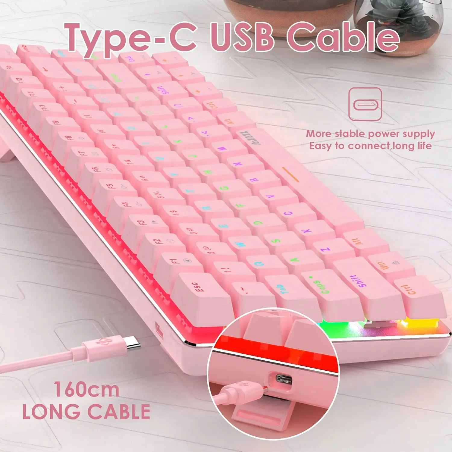 Ergonomic design: Suspended body with keycap height and slope tuned for comfort to reduce fatigue. Compact size saves desk space, and keycaps can be removed for cleaning or replacement.