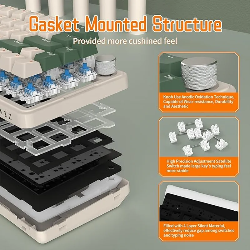 Gasket mount, flex-cut PC plate & sound-absorbing foam: A gasket-mounted structure isolates the plate from the case to reduce vibration. Combined with a flex-cut PC mounting plate and four layers of sound-dampening material, it delivers a consistent, satisfying typing feel and sound.