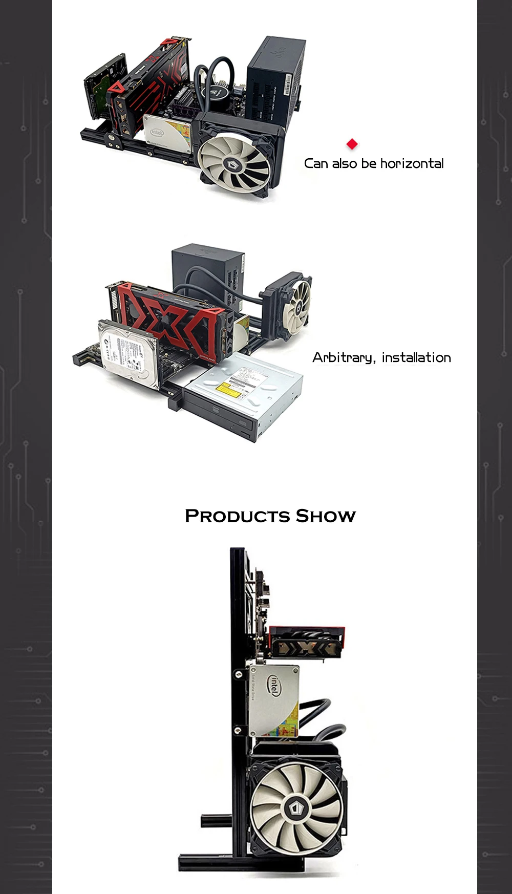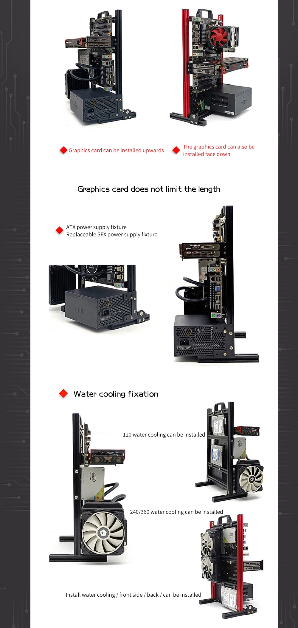Introducing the Aluminum Fully Open Case Frame, an innovative and stylish solution designed to support ITX, MATX, and ATX motherboards. This vertical computer housing is perfect for gamers and PC enthusiasts looking to build a high-performance system with optimal cooling and easy accessibility.