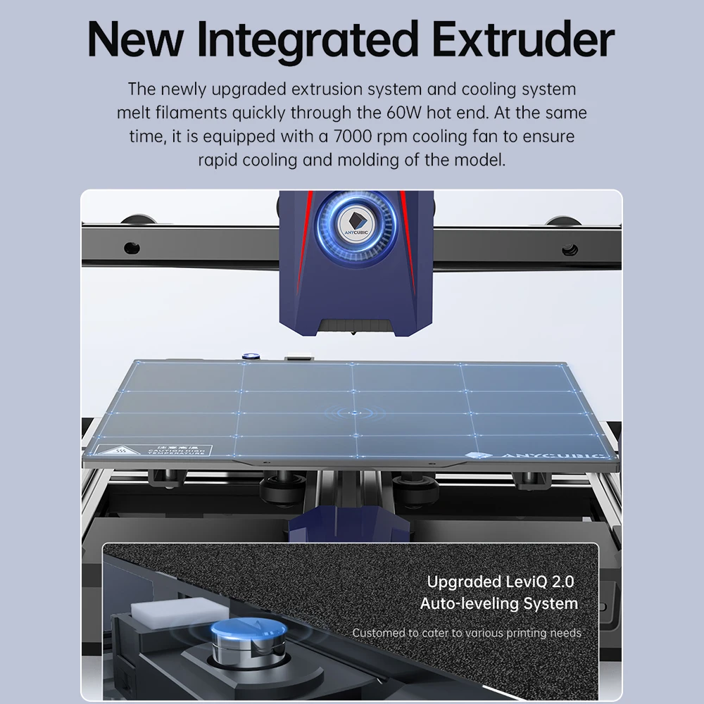- New Integrated Extruder: The upgraded extrusion system features a 60W hot end for quick filament melting, complemented by a 7000 rpm cooling fan. This ensures rapid cooling and molding of models, enhancing the overall printing process.