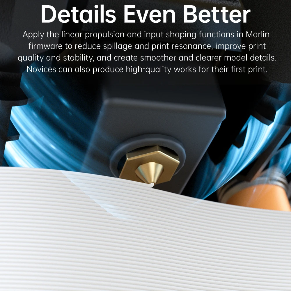 - Enhanced Detailing: Incorporating linear propulsion and input shaping functions from Marlin firmware, the printer reduces spillage and print resonance. This improves print quality and stability, yielding smoother and clearer model details, suitable even for novices.