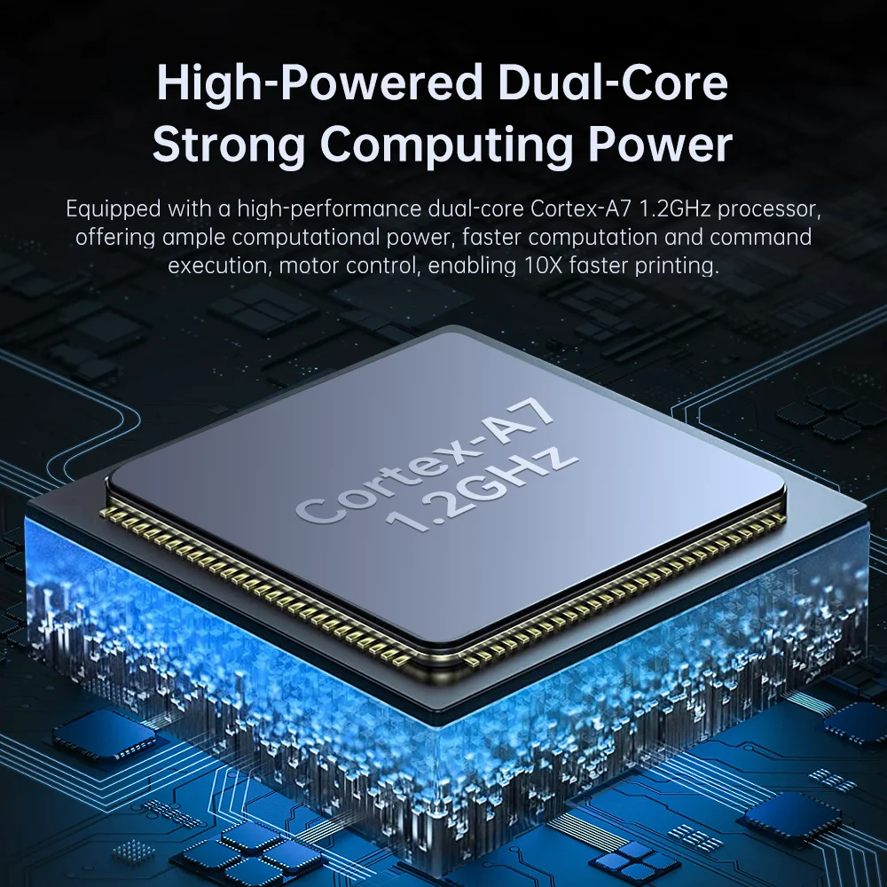 High-Performance Dual-Core Processor: The printer is equipped with a high-performance dual-core Cortex-A7 processor, clocking at 1.2GHz. This powerful processor ensures faster calculations, efficient execution of commands, and precise motor control, contributing to a printing speed that is 10 times faster than standard models.