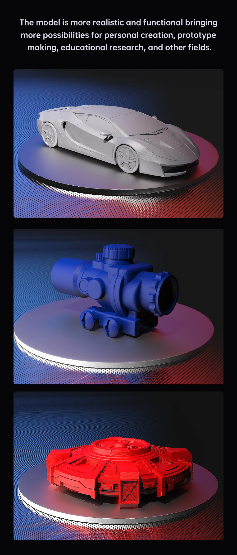 Compared to mainstream FDM 3D printers, the printing speed is increased by 10 times.