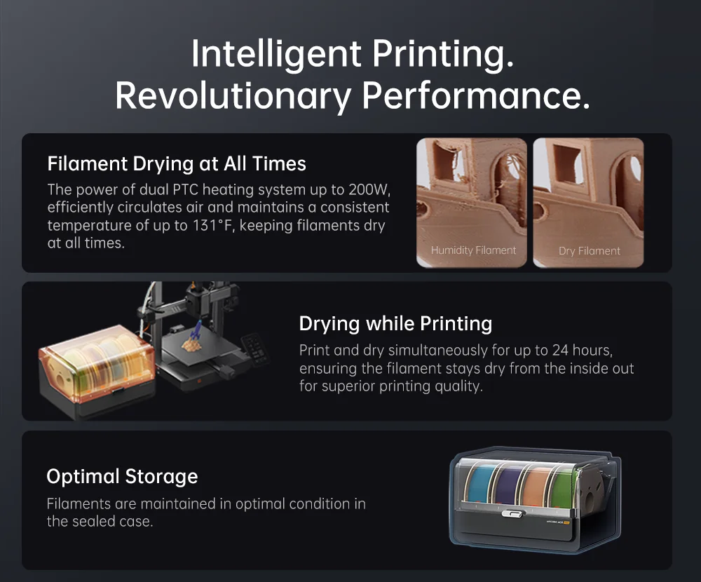 The power of the dual PTC heating system, up to 200W, efficiently circulates air and maintains a consistent temperature of up to 131°F, keeping filaments dry at all times.