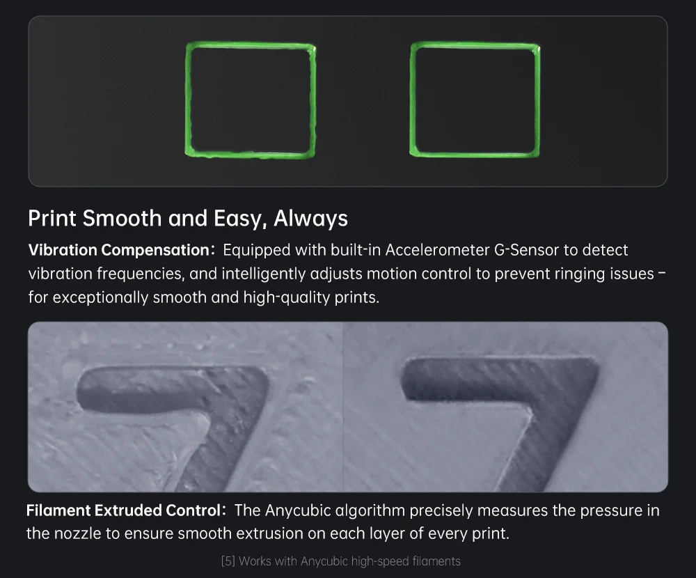 Vibration Compensation: Equipped with a built-in Accelerometer G-Sensor to detect vibration frequencies and intelligently adjust motion control to prevent ringing issues – for exceptionally smooth and high-quality prints.