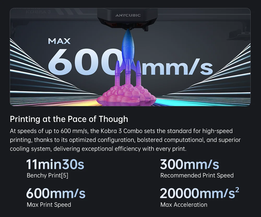 At speeds of up to 600 mm/s, the Kobra 3 Combo sets the standard for high-speed printing, thanks to its optimized configuration, bolstered computational power, and superior cooling system, delivering exceptional efficiency with every print.