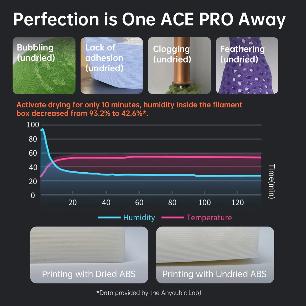 The ACE PRO comes standard with humidity presets for various types of filaments. Simply select your desired filaments and wait for the perfect result.