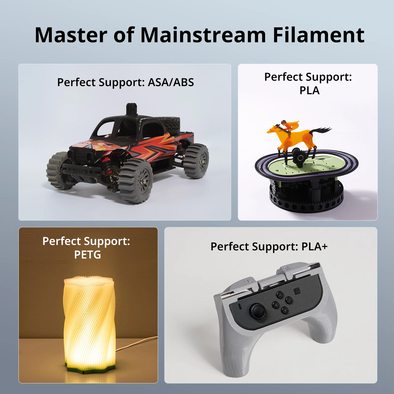 It can perfectly print PLA, PETG, TPU (95A), ABS, and ASA. Additionally, it supports high-temperature materials such as PC, PA, carbon fiber, and glass fiber.