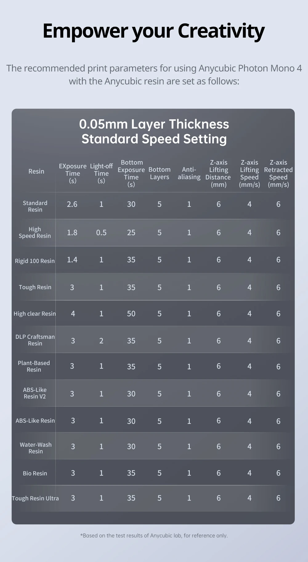 The recommended print parameters for using Anycubic Photon Mono 4 with Anycubic resin are set as follows: