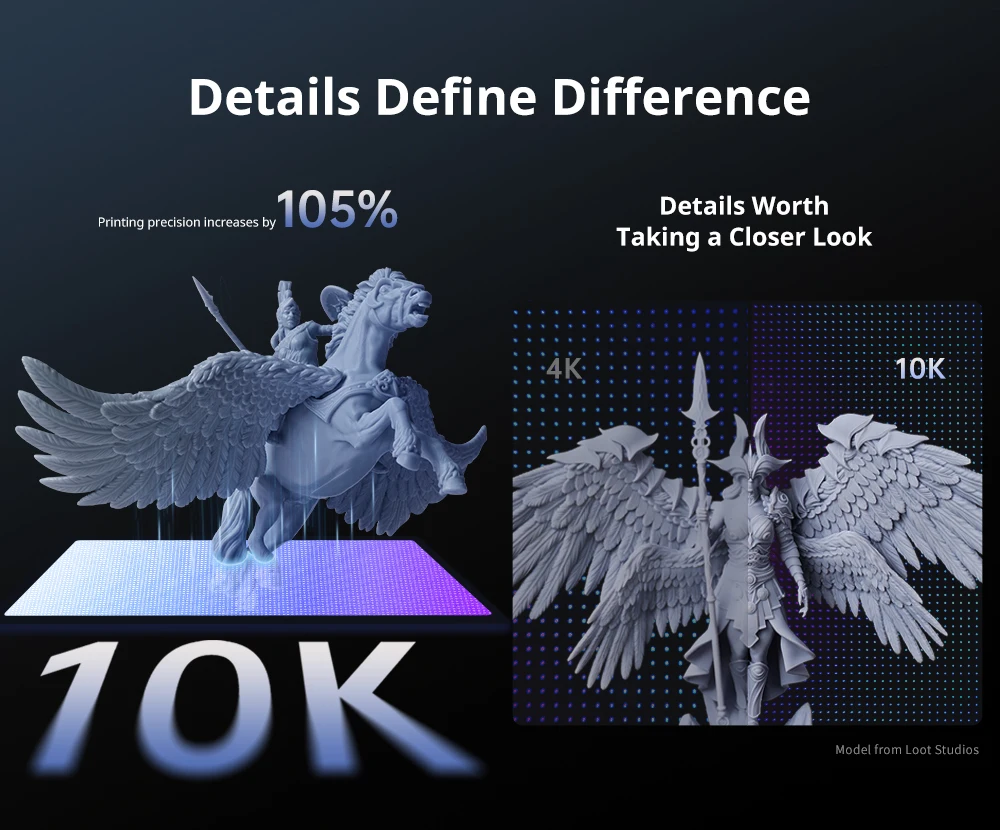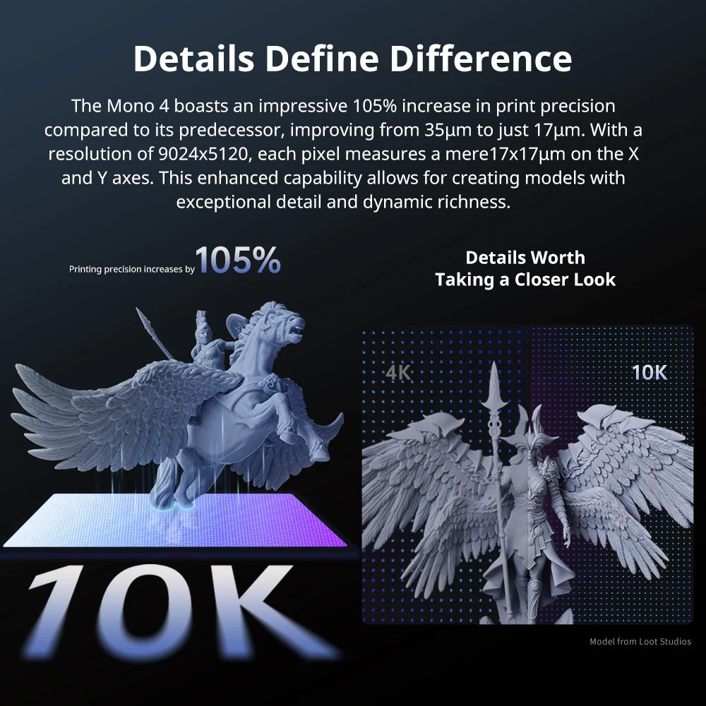 The Mono 4 boasts an impressive 105% increase in print precision compared to its predecessor, improving from 35µm to just 17µm. With a resolution of 9024×5120, each pixel measures a mere 17×17µm on the X and Y axes. This enhanced capability allows for creating models with exceptional detail and dynamic richness.