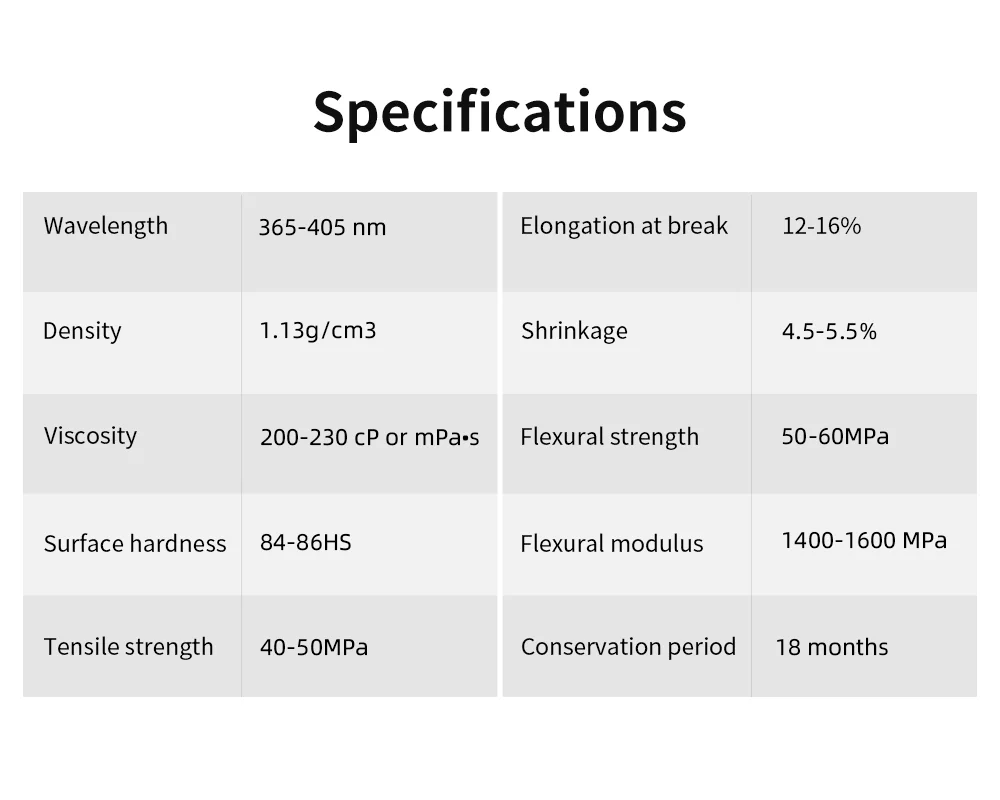 Viscosity 200-230 cP or mPa·s   Flexural strength 50-60 MPa