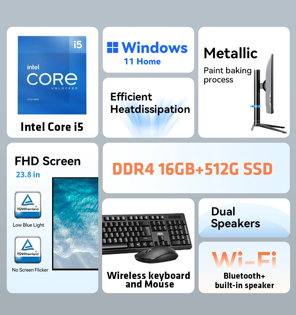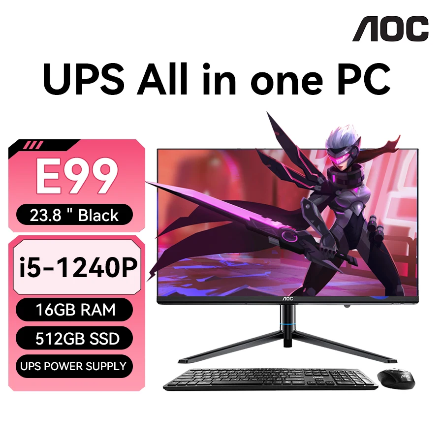 The AOC All-in-one Computer E99 is a versatile and powerful computing solution designed for both gaming and office use. Featuring a sleek 23.8-inch display, this all-in-one PC is powered by an Intel i5-1240P processor, ensuring robust performance for a variety of applications. Paired with 16GB of DDR4 RAM and a 512GB SSD, it offers ample memory and storage for multitasking and fast data access.
