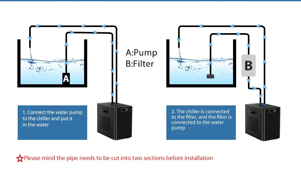 - Usage Suggestions – Cooling efficiency depends on ambient temperature and tank size. For instance, with a room temp of 77℉, the AL-160 can reduce the temperature of a 150L tank to 75–78℉. A 35-gallon (132 L) tank can reach around 73℉. For water below 68℉, use a tank smaller than 80L. For better cooling, consider upgrading to the AL-300 model.