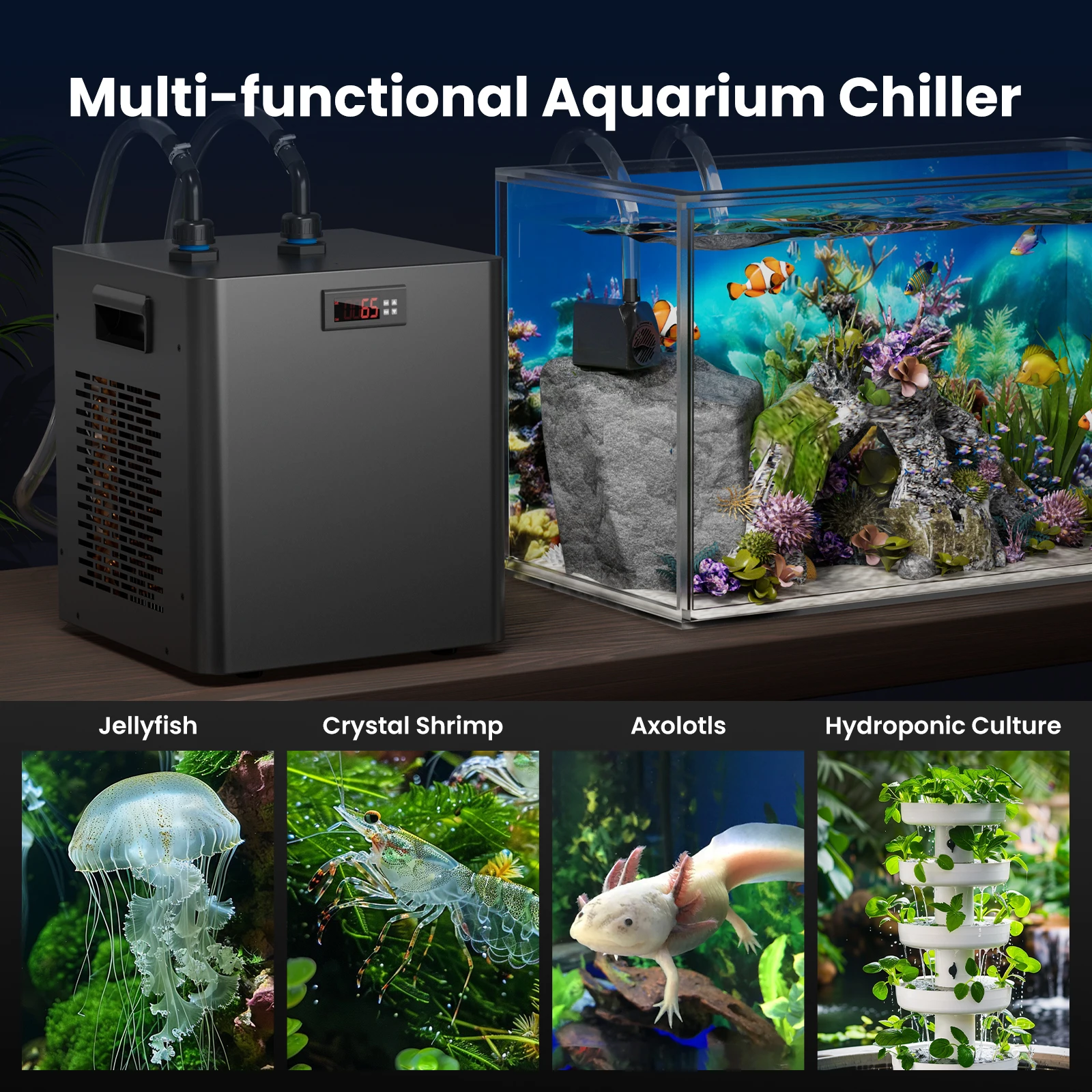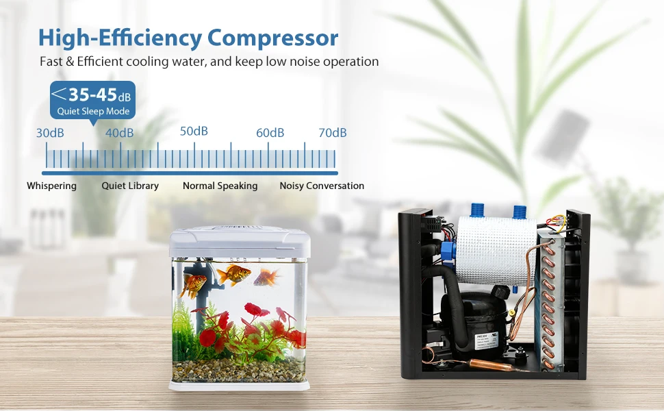 - Premium Refrigeration Compressor – The compressor uses R134a refrigerant for circulation cooling. It’s eco-friendly and non-polluting. The chiller temperature can be maintained between 68℉–79℉ (20℃–26℃), supporting healthy plant growth and aquatic life like axolotls. It features a corrosion-resistant pure titanium pump compatible with both freshwater and saltwater.