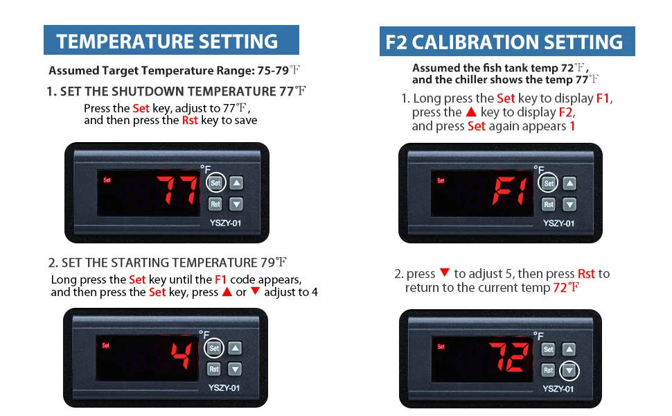 - Tolerance Setting – Each chiller features a tolerance setting (F1), adjustable from 1 to 60. For example, if the start temp is set to 79°F and the tolerance is 2, the chiller will activate at 79°F and cool until it reaches 77°F, then repeat as needed.