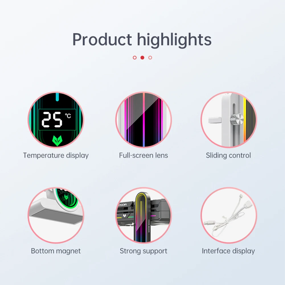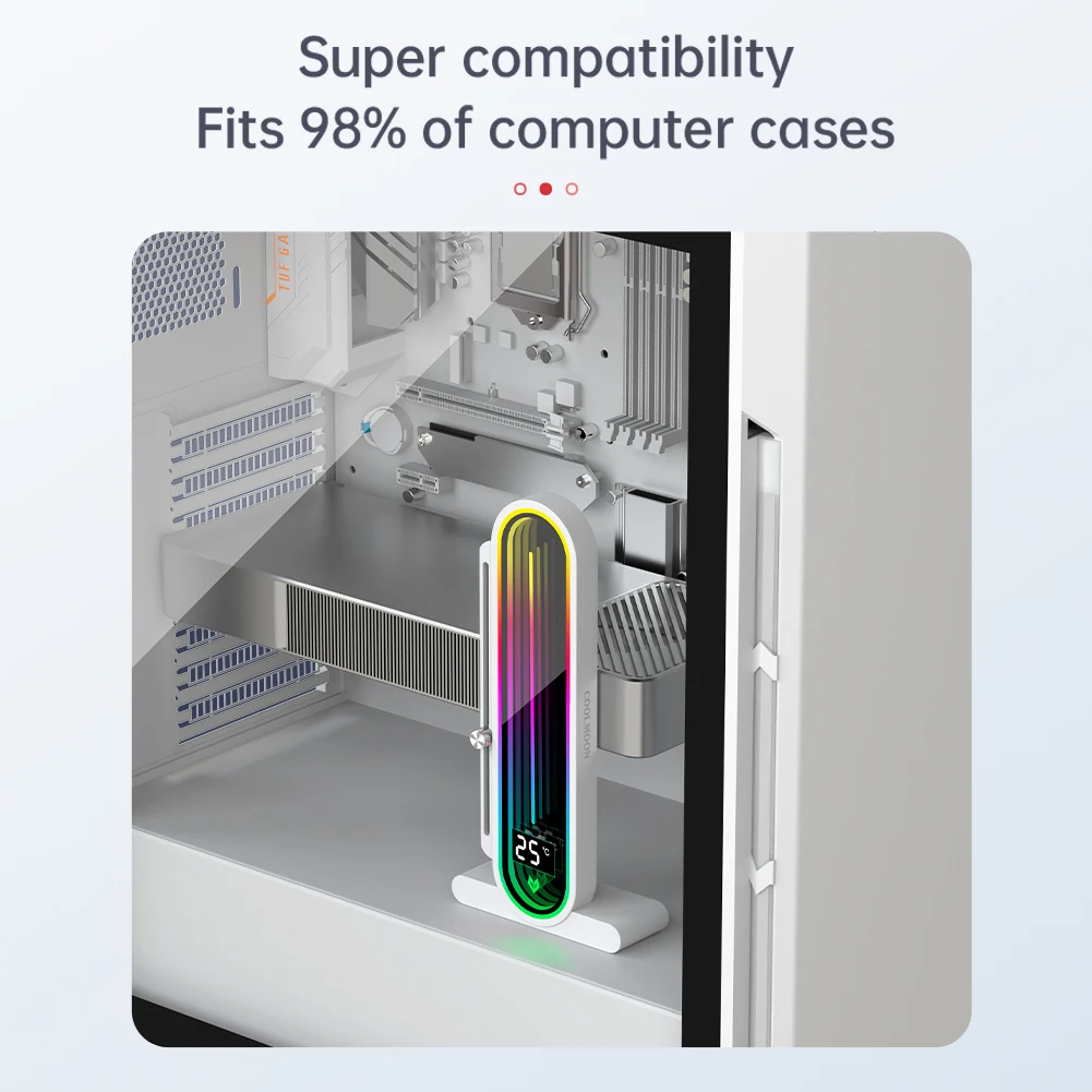 1. Temperature Display Screen: The graphics card bracket features an arc full-screen lens design with an LED smart temperature display. The automatic temperature sensing technology displays the internal temperature of the case in real time, so you can easily monitor operating conditions. Only the G30 Pro series supports this feature.
