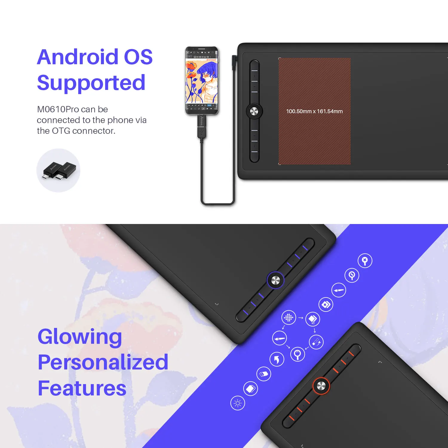 - The tablet is compatible with Android 6.0 or later versions. Connecting the pen tablet to an Android device via an OTG adaptor is supported, greatly facilitating drawing outdoors.