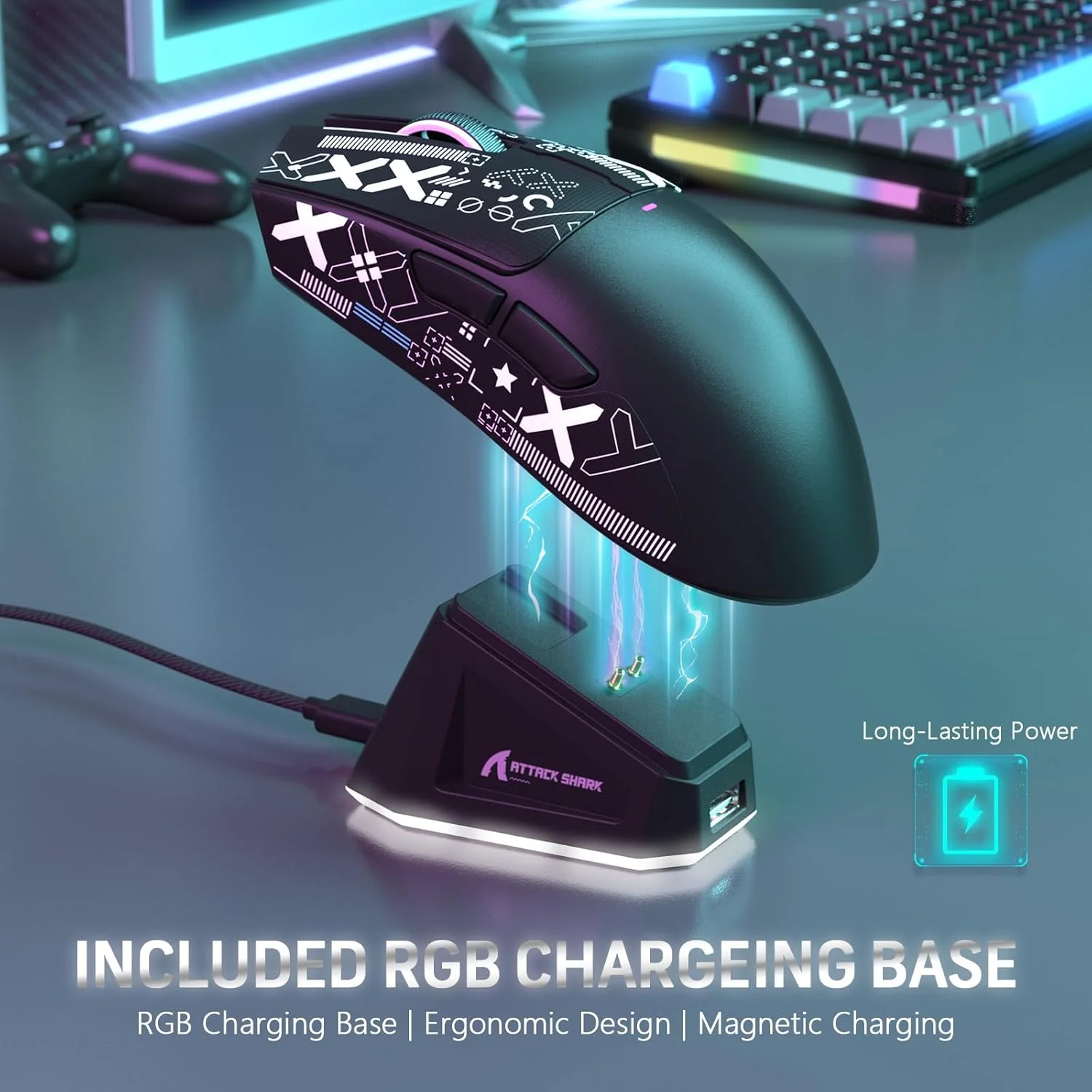 - Magnetic Fast Charging Base with RGB: Includes a fast charging base. It can be used for 5 hours of play after 10 minutes of charging (a full charge is shown as lasting up to 65 hours). The charging base includes a USB interface, so you only need to occupy one computer USB port for both the mouse and the charging stand. Adjustable RGB lighting can be turned on or off.