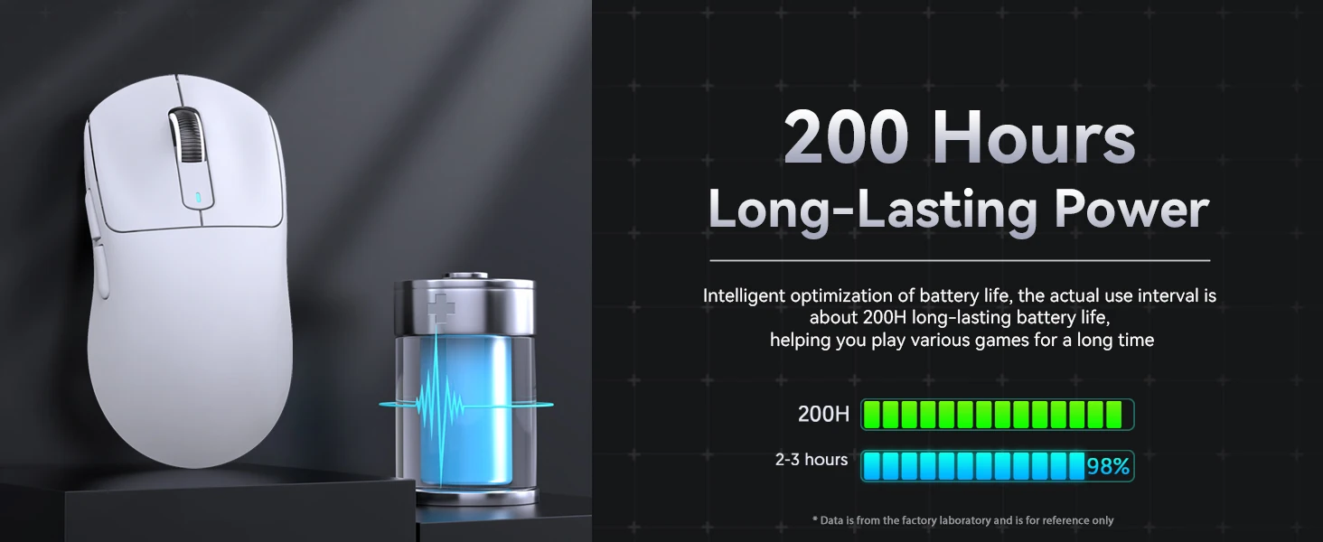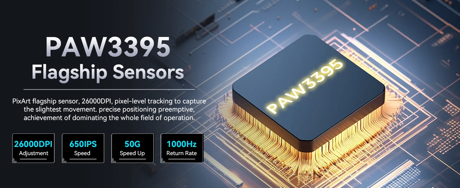 - Flagship sensor: PixArt PAW3395 with 800 to 26000 DPI adjustment, 650 IPS tracking speed, and 50G acceleration.