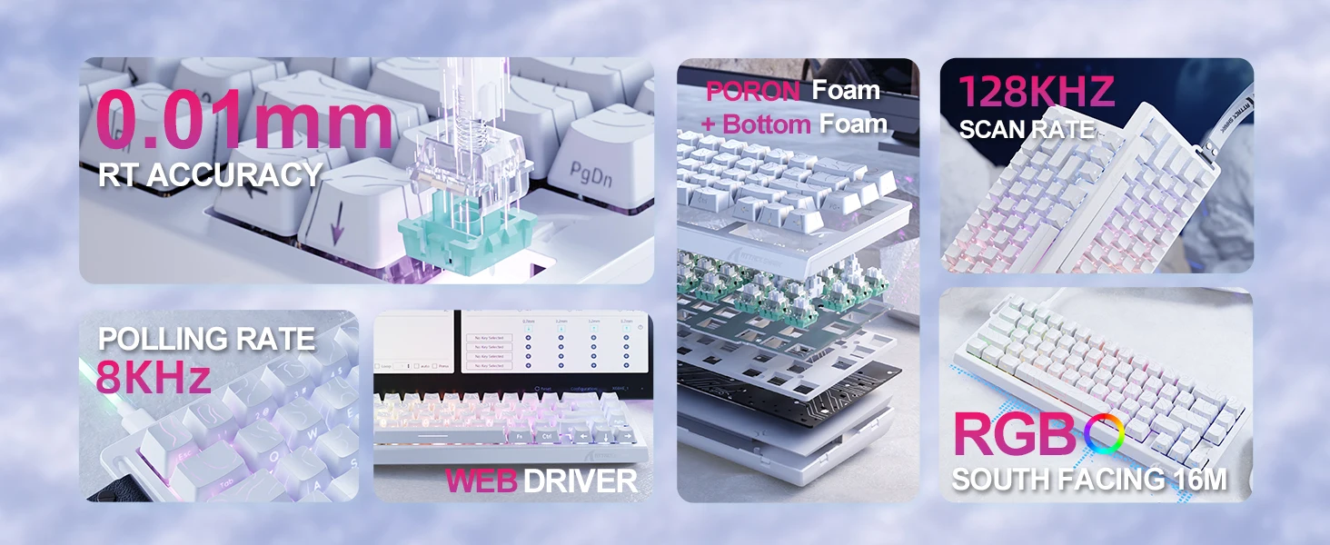 60% magnetic switch keyboard with rapid trigger. Equipped with adjustable Hall-effect magnetic switches, this ATTACK SHARK X68HE lets you bind up to four functions to a single key at four distinct press depths. Adjust the actuation point from 0.1 mm to 3.4 mm. A true 8000 Hz polling rate reduces theoretical latency to 0.125 ms for flexible, ultra-responsive control—ideal for FPS and rhythm games like Valorant and Osu.