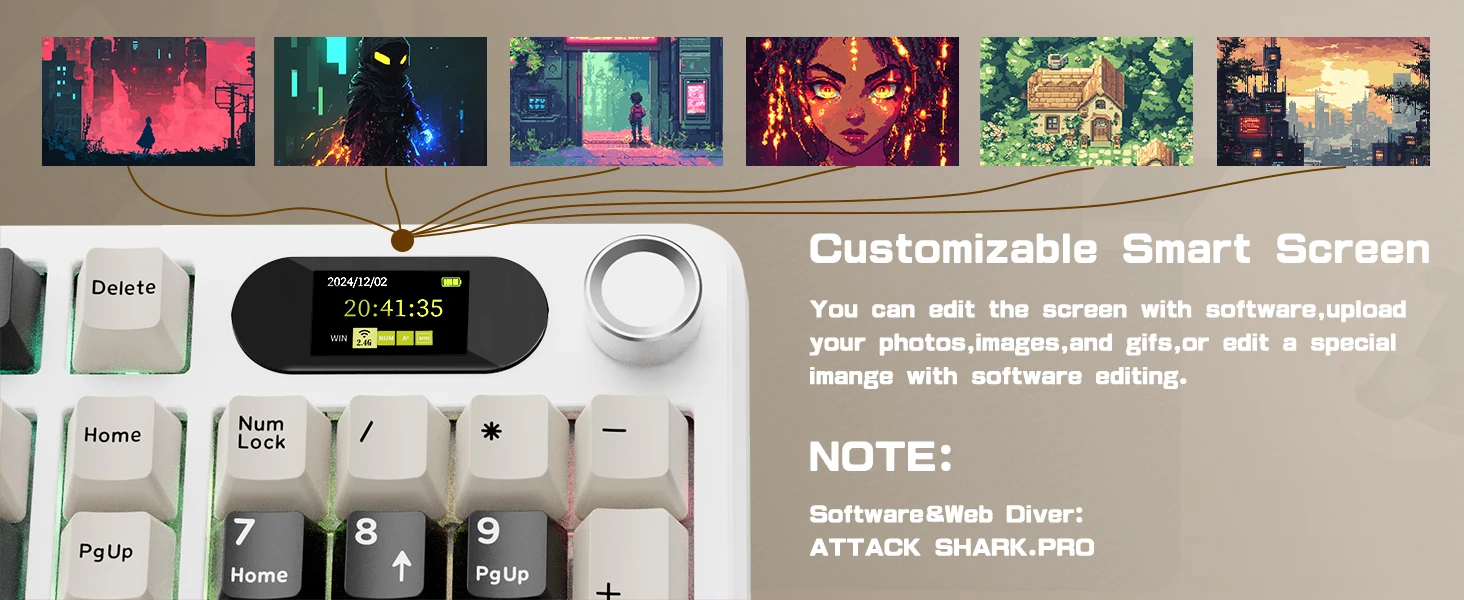 - Customizable TFT screen shows real-time status, GIFs, battery level, connection mode, RGB settings, and more.