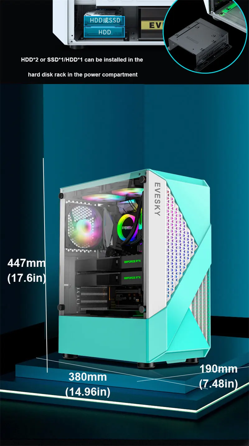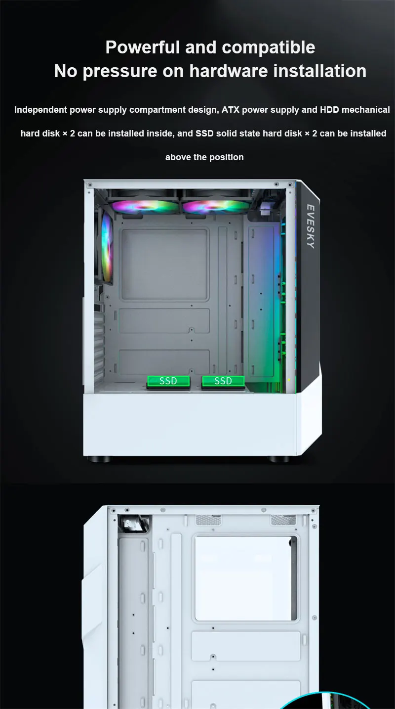 The case provides ample space for hardware installation without pressure. It features an independent power supply compartment design, allowing for internal installation of an ATX power supply and up to two HDD mechanical hard disks. Additionally, two SSD solid-state hard disks can be installed above the power supply bay, with options for either two HDDs or a combination of one SSD and one HDD in the hard disk rack.