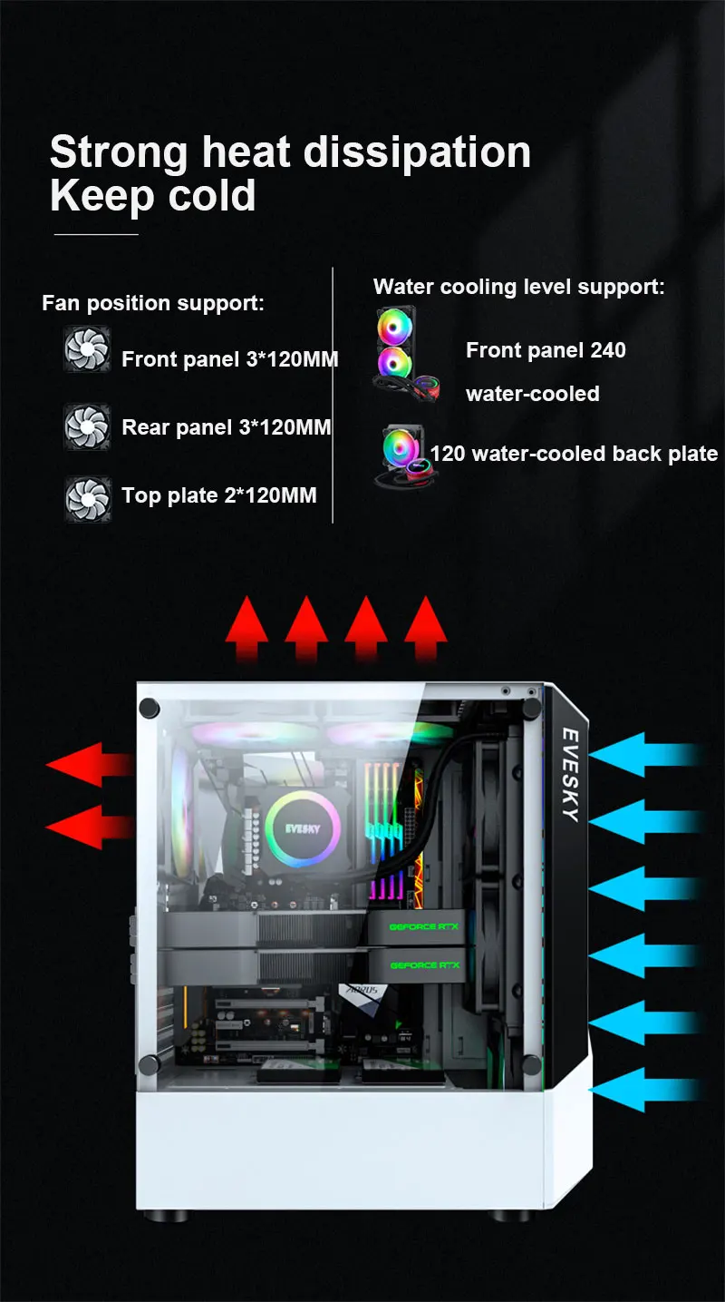 - Front Panel: 3 x 120mm (supports 240mm water cooling)