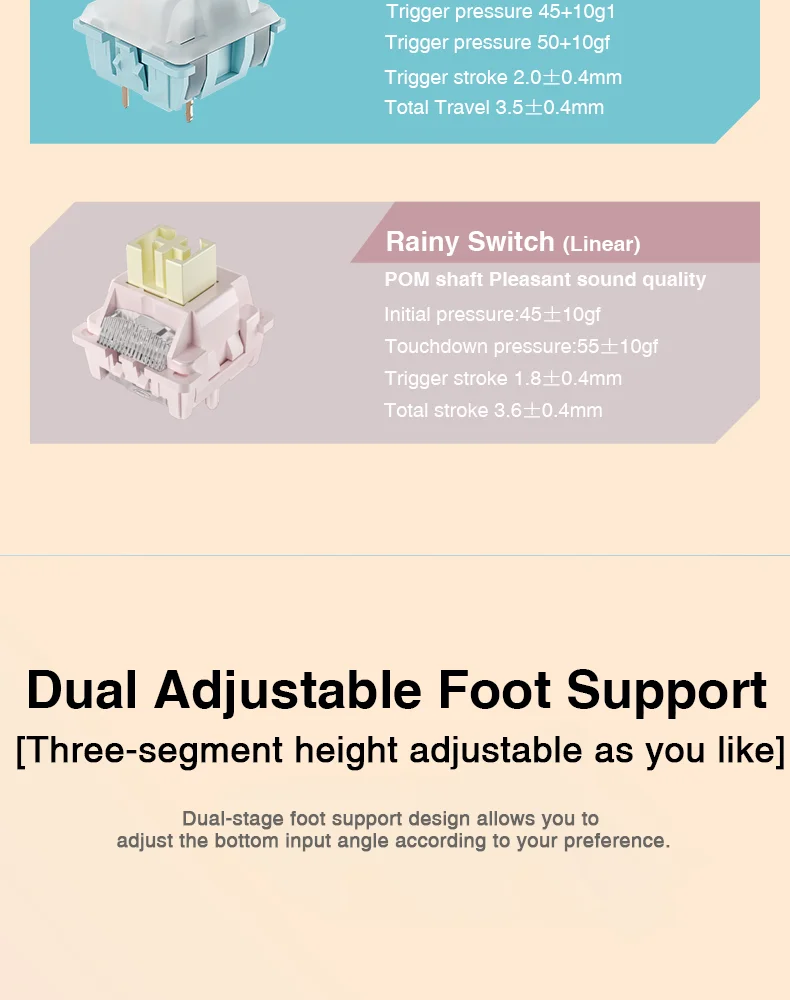 - Initial force: 45 ± 10 gf | Bottom-out: 55 ± 10 gf | Pre-travel: 1.8 ± 0.4 mm | Total travel: 3.6 ± 0.4 mm