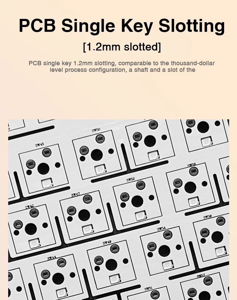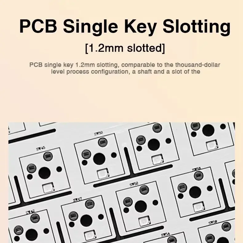 1.2 mm per-key PCB slotting, comparable to high-end builds for improved consistency while preserving a soft, comfortable feel.