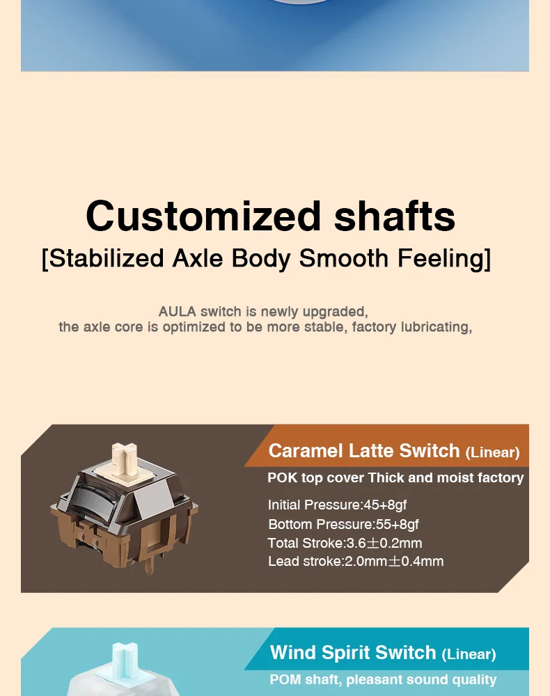 - Initial force: 45 ± 8 gf | Bottom-out: 55 ± 8 gf | Total travel: 3.6 ± 0.2 mm | Pre-travel: 2.0 ± 0.4 mm